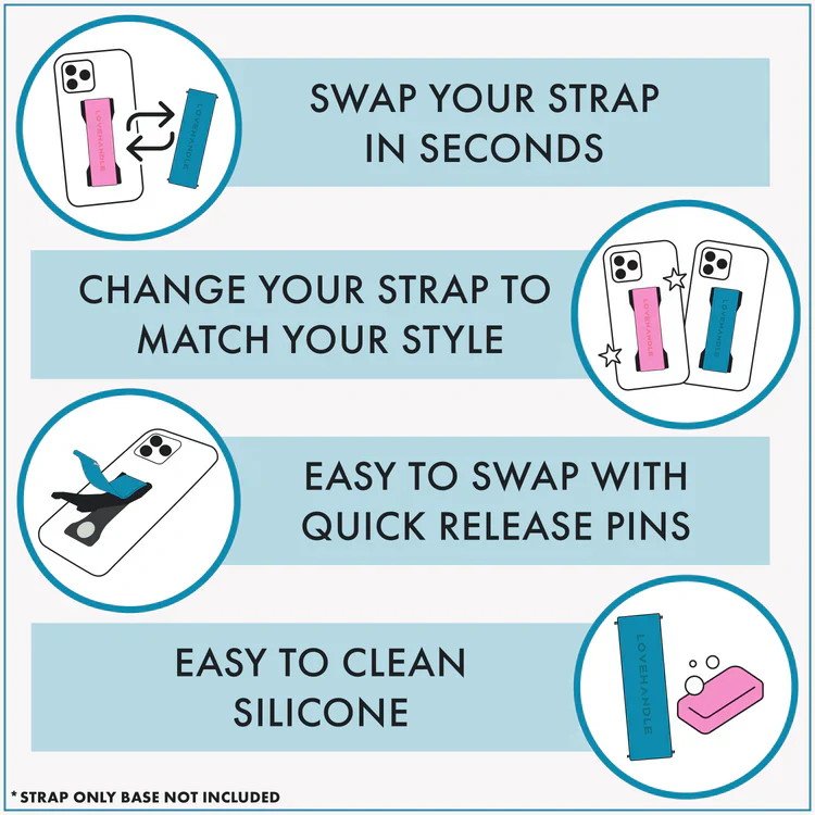 A 1" elastic strap equipped with two pins allowing for you to easily swap the strap on your LoveHandle PRO phone grip.