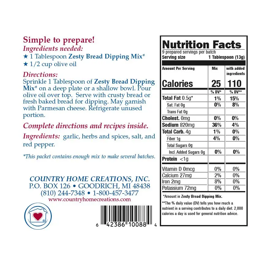 Zesty Bread Dipping Mix is the best bread dipping oil you will ever taste! It combines garlic, crushed red pepper, and several other herbs and spices to give you a bold flavor that makes a perfect start to any Italian meal or complement to your favorite wine. Each packet makes several batches! This blend can also be used to season your potatoes and vegetables with a little olive oil. All Natural Gluten-Free No MSG Vegan
